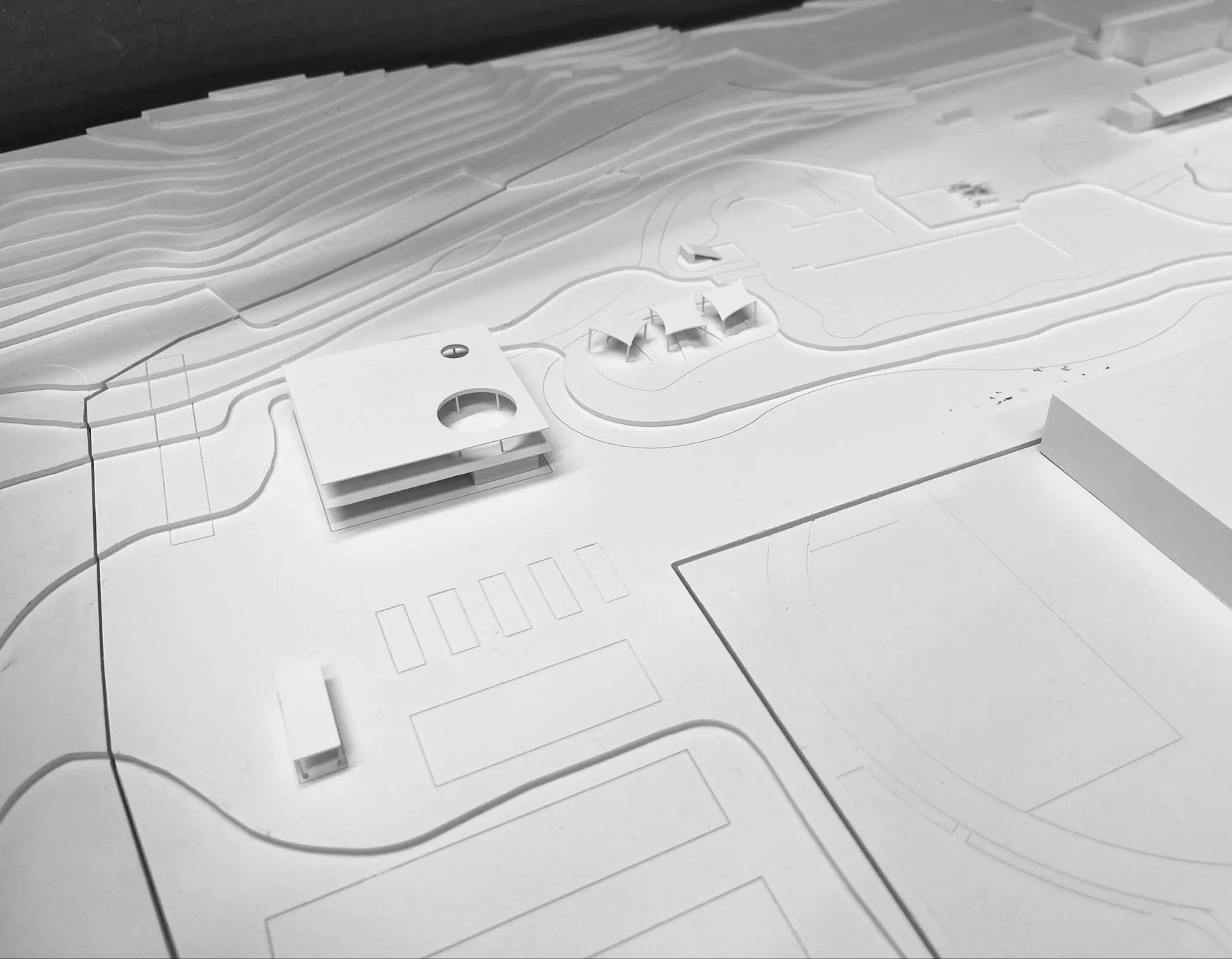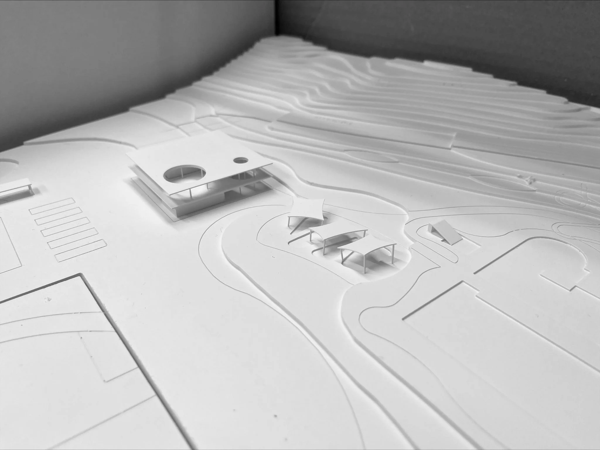 Der Freibadperimeter weisst eine Höhendifferenz von Nord-Süd von 4 Metern auf, wobei der neue Haupteingang im Norden den tiefsten Punkt des Areals darstellt. Aus diesem Grund wird das neue Freibadgebäude zweigeschossig projektiert und ermöglicht so einen schönen Weitblick aus dem Obergeschoss in die bestehende Badanlage sowie in das umliegende Sport- und Freizeitareal.