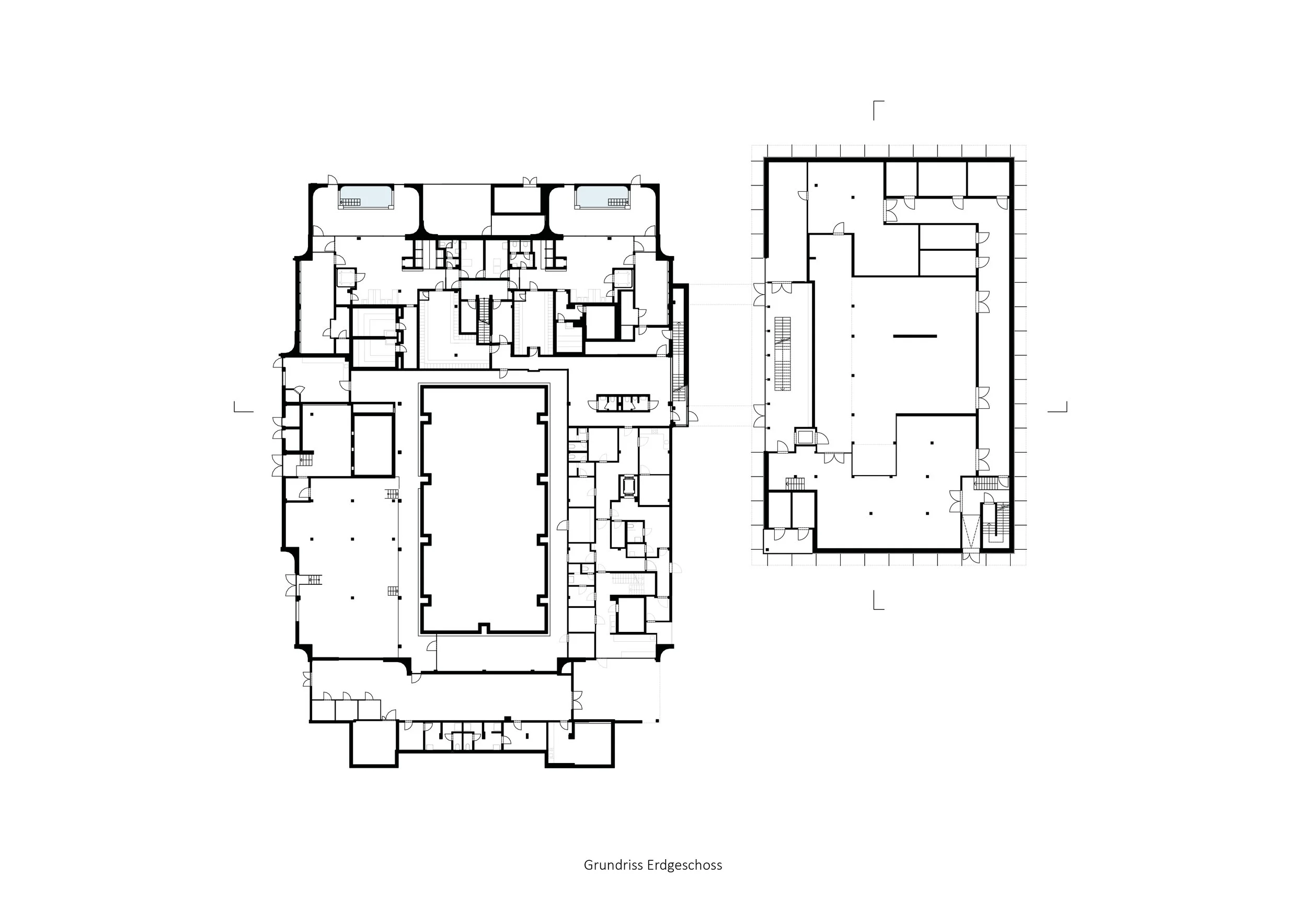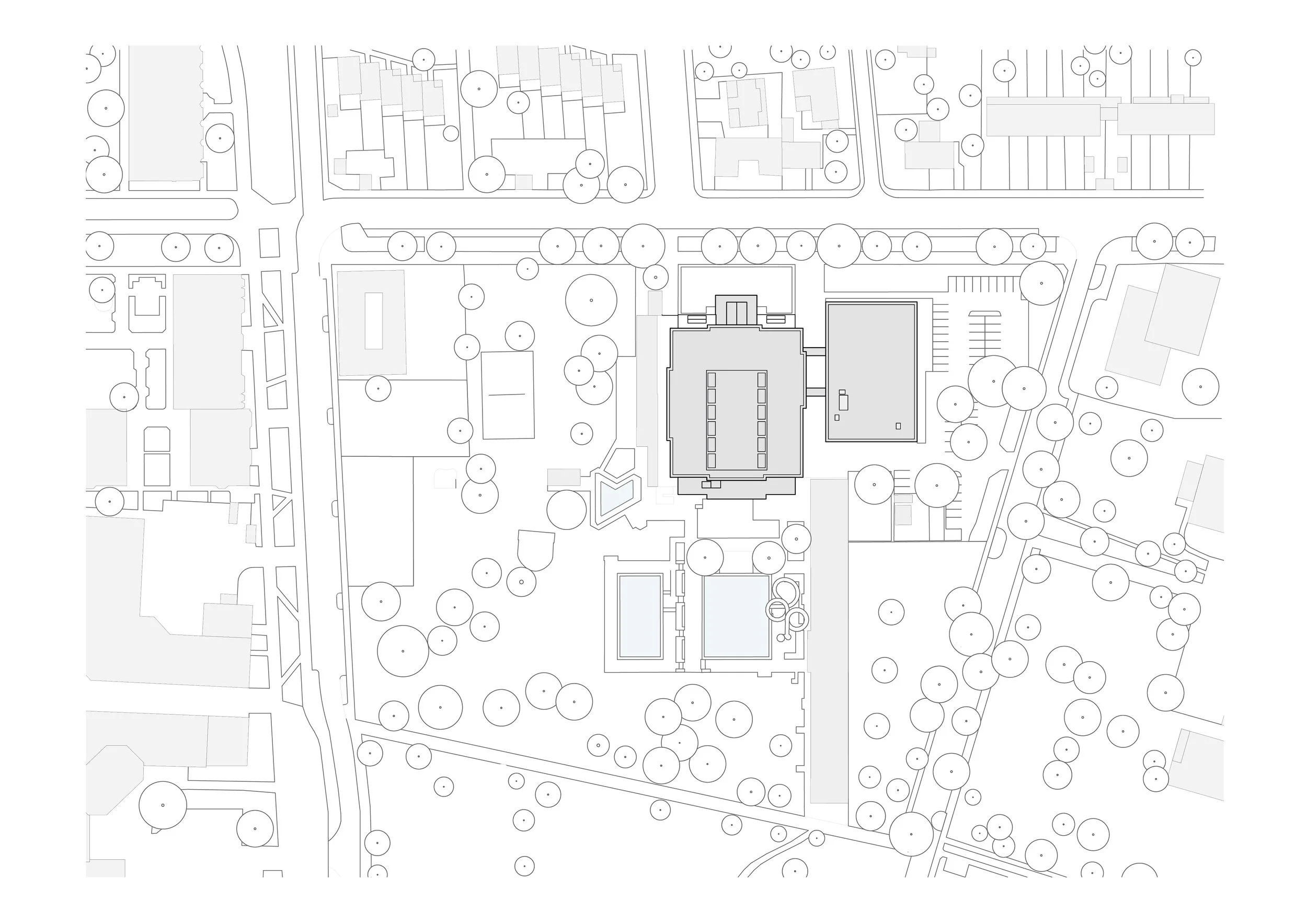 Die neue Trainingsschwimmhalle für das Kombibad in der Wiener Großfeldsiedlung besetzt mit kompaktem Fußabdruck Teile des früheren Parkplatzes und knüpft über zwei freitragende Brücken an den Bestand an. Zwischen Alt- und Neubau entsteht eine grüne Gasse, welche die BesucherInnen zum neuen Haupteingang unter den Brücken leitet. Bereits beim Näherkommen erspäht man durch die verglaste Fassade eine sich hochwindende Treppe, die auf die Beckenebene im 1. Obergeschoss führt. Von hier vernetzen die beiden Brücken das neue Foyer mit der Kassahalle im Bestand und schaffen einen zusammenhängenden Erschließungsraum, der die Besucherströme betrieblich entflechtet, die unterschiedlichen Funktionsbereiche jedoch visuell miteinander verwebt.