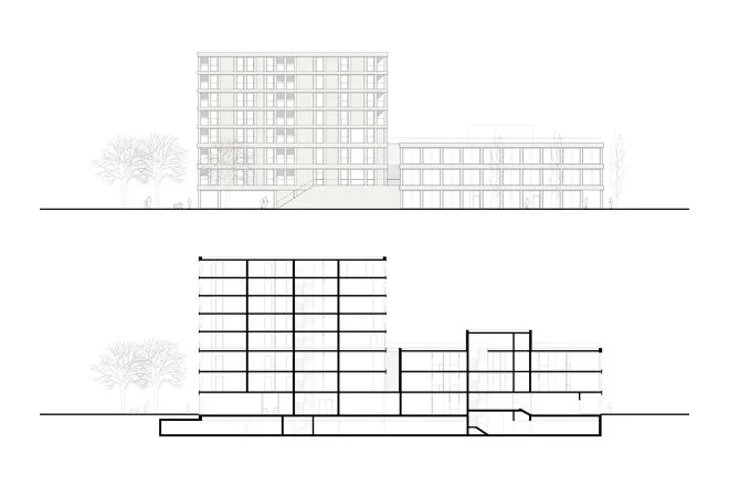 Die Fassade basiert auf einem Raster von 1.60m und ermöglicht eine flexible Raumeinteilung mit verschieden großen Zellenbüros, Kombibürostrukturen mit abwechselnd geschlossenen und offenen Raumeinheiten. Die Wohnungen werden mit kleinem Footprint vertikal als 3- bis 7-Spänner im Turm konzentriert. Das Fluchtniveau des obersten Wohngeschosses bleibt unterhalb von 22m. Ziel ist die Schaffung von zeitgemäßen und „smarten“ Wohnungen mit attraktiven Freiräumen, die eine starke Identifikation durch selbstbestimmtes Wohnen zulassen.